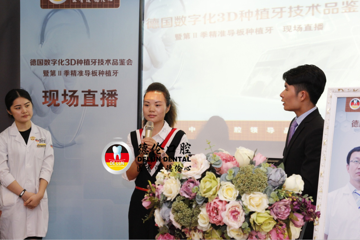 在11月14日舉行的德倫口腔“首屆3D導板數字化種植牙真人直播”的現場,一個年輕的身影的走上了舞臺,她正是德倫口腔3D導板數字化種植牙的受益者之一鄒女士。當鄒女士聽聞程武醫生要進行種植手術直播的時候,她主動提出希望可以到現場分享她的種植感受,用自己真實的經歷來發聲,呼吁年輕人有任何牙齒問題都需要及早治療,不要以為能拖就脫,結果錯過治療黃金期。